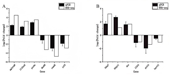 qRT-PCR validation of selected DEGs identified by RNA-Seq. Expression levels of six genes in (A) liver and (B) spleen from infected vs. control fish were measured by qRT-PCR (black filled bars) and compared to RNA-Seq fold changes (white open bars). Data are presented as mean relative expression (infected/control) ± SD (n = 3). In the liver (A), pglyrp6, il13ra2, and ptx3a showed up-regulation, and dhx58, rsad2, irf3 showed down-regulation, consistent with transcriptome results. In the spleen (B), fkbp7, fkbp11, dcn were up-regulated, and il2rb, prlrb, hprt1l were down-regulated, matching RNA-Seq trends. The high concordance between qRT-PCR and RNA-Seq indicates the reliability of the gene expression data.