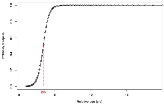 The probability of selectivity of S. commerson in Omani waters is the age at t50, which is the age at which the gear catches 50% of the fish.