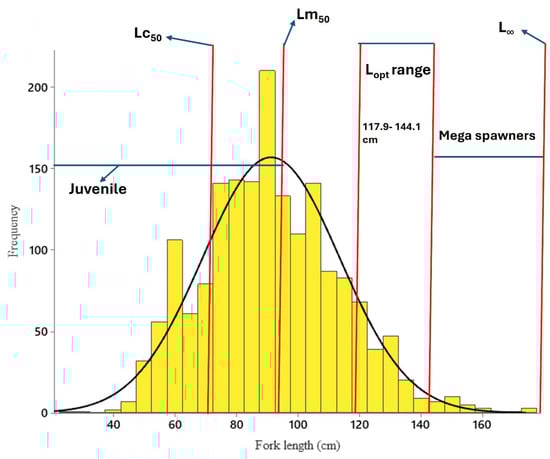 Length–frequency distribution of S. commerson in the coastal water of Oman in relation to the Lc50 (length at 50% capture), Lm50 (length at 50% maturity), Lopt range (optimum length range), and L∞ (asymptotic length).