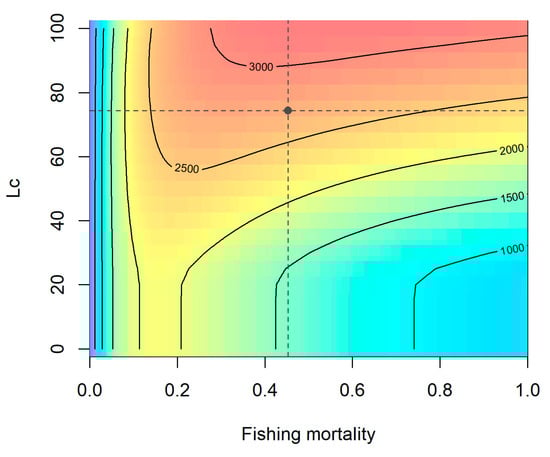 The optimal fishing mortality (F40%) was determined to be 0.15 yr−1 for S. commerson. The current fishing mortality (F2019 = 0.45 ) is higher than F40%. Additionally, the reference points F0.1 (0.16) and Fmax (0.3) suggest that growth overfishing is unlikely to be occurring for this species. The F0.1 fishing mortality rate corresponds to a point on the yield-per-recruit curve where the slope is 10% of that at the origin, and with a management regime aimed at achieving a specific economic end []. The current fishing mortality of S. commerson is higher than F40% and F0.1. Therefore, the fishing pressure should be reduced to approximately 0.32 yr−1, i.e., 29% from the present level of mortality, 0.45 yr−1, to obtain a sustainable yield of S. commerson in Omani waters.