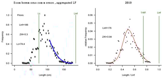 where is the asymptotic length, is the natural mortality, and is the growth coefficient. This formula was adapted from []. The Lopt range was defined as ±10% of the estimated Lopt, and individuals exceeding this range were classified as mega spawners []. The detailed description of the LBB method is provided in [].