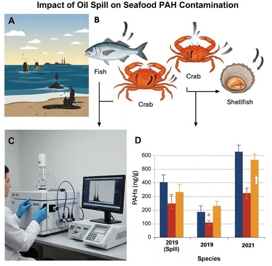 Key Contribution: Concentration levels of PAHs in Brazilian seafood were updated post-oil spill, revealing that fish and shellfish were more contaminated than crabs. In 2019, PAH levels were approximately 50% higher than in 2021, suggesting acute contamination from the spill. A residual effect persisted in 2021, with an increase in pyrogenic PAH sources. Notably, indeno[1,2,3-cd]pyrene concentrations in fish and shellfish, as well as benzo[a]pyrene in 2021 shellfish, exceeded legal limits for human consumption.