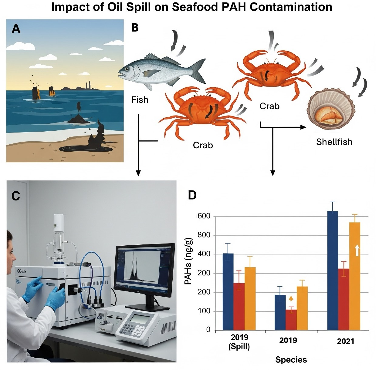 This study also reveals a potential public health risk from lingering contamination with carcinogenic PAHs, even 2 years after the event, under the projected scenario (adults weighing 60 kg, with 70 years of exposure, and a consumption range of 60 to 180 g/kg of body weight). The persistence of these compounds, even after the acute phase of the spill, underscores the critical need for long-term environmental monitoring and robust regulatory frameworks to protect seafood safety and public health in coastal areas vulnerable to both acute and chronic pollution events.