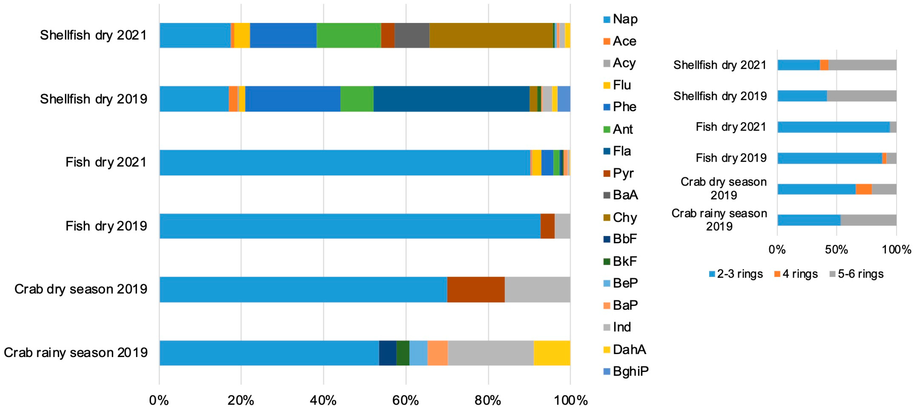 Figure 2. Percentages of PAH compounds in crab, fish, and shellfish from the Parnaiba Delta River, Piaui, during and after the 2019 oil spill.