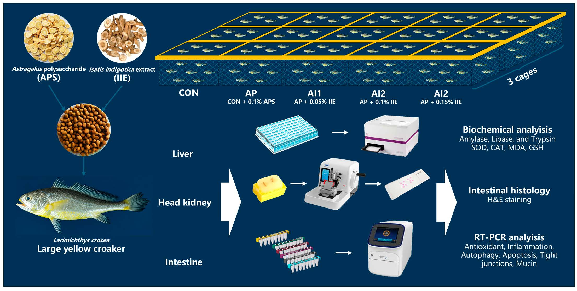 Chen, Z.; Zeng, C.; Wang, A.; Wang, H.; Zhi, X.; Chen, Z.; Lv, H.; Qi, Q.; Wang, P.; Shao, J.; et al. Effects of Astragalus Polysaccharide and Isatis indigotica Extract Synergy on the Antioxidant Status, Inflammation, Autophagy, Apoptosis, and Intestinal Health of Larimichthys crocea Juveniles. Fishes 2025, 10, 593. https://doi.org/10.3390/fishes10110593