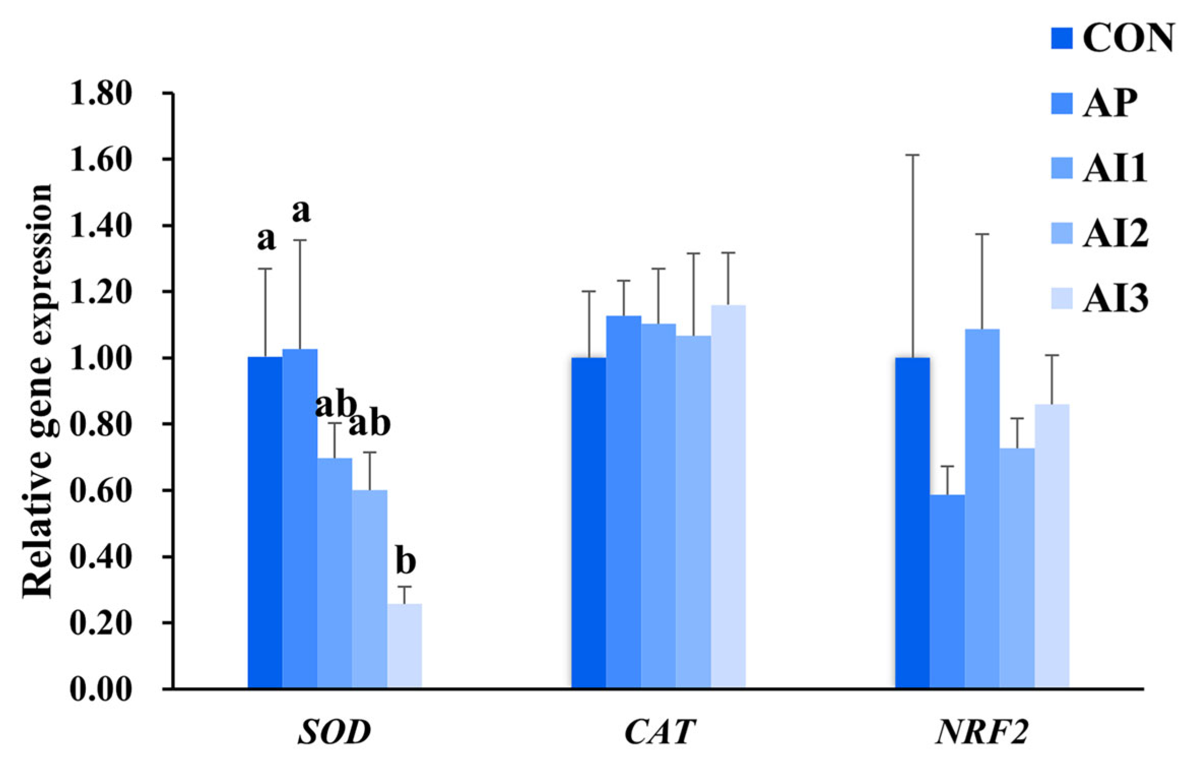 | T-AOC (mmol/g protein) | 0.155 ± 0.014 | 0.152 ± 0.01 | 0.123 ± 0.026 | 0.146 ± 0.01 | 0.156 ± 0.019 |
