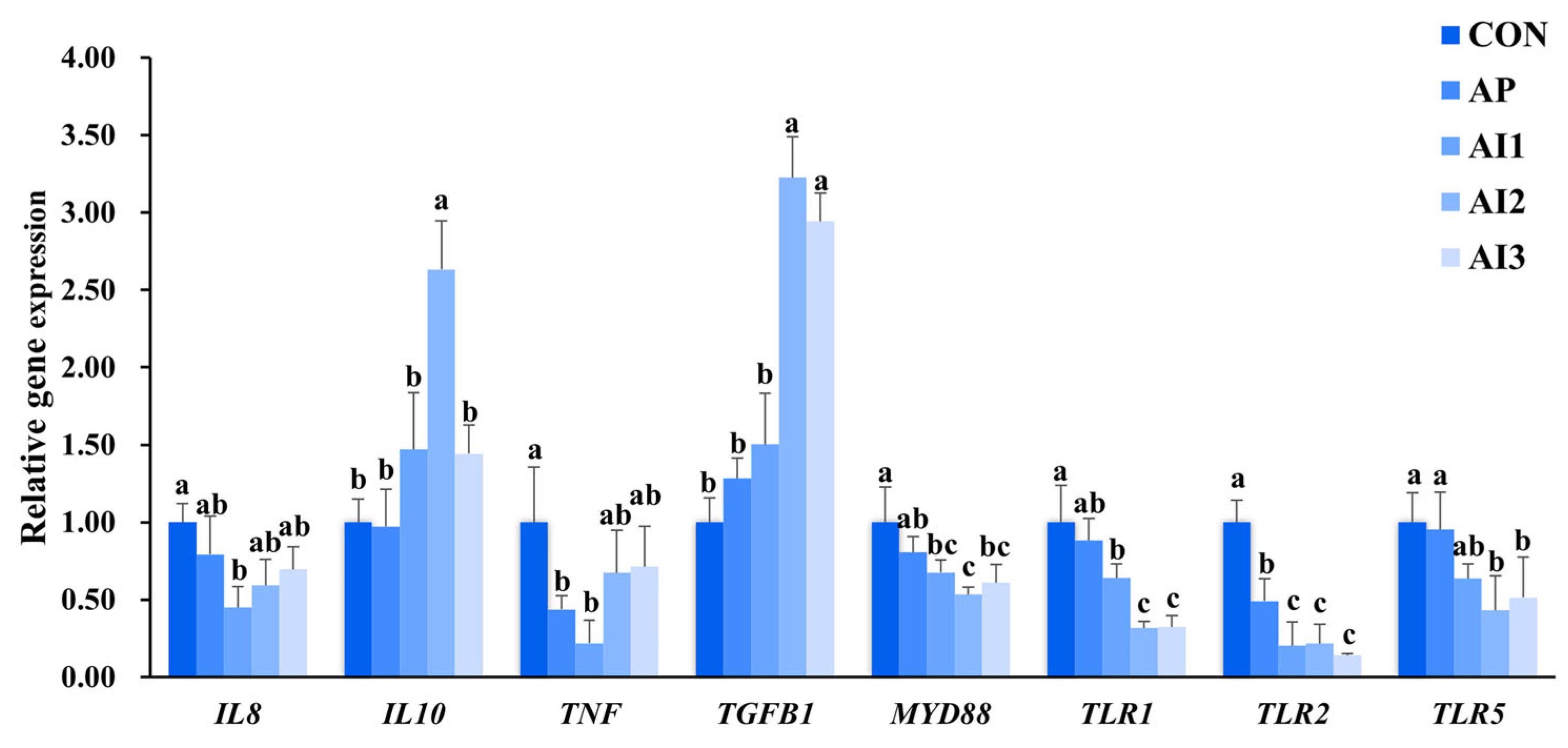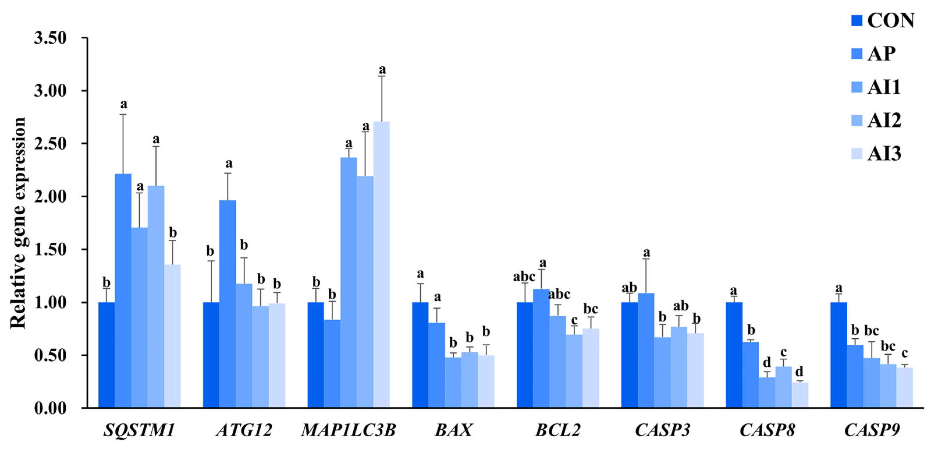 APA StyleChen, Z., Zeng, C., Wang, A., Wang, H., Zhi, X., Chen, Z., Lv, H., Qi, Q., Wang, P., Shao, J., & Chen, X. (2025). Effects of Astragalus Polysaccharide and Isatis indigotica Extract Synergy on the Antioxidant Status, Inflammation, Autophagy, Apoptosis, and Intestinal Health of Larimichthys crocea Juveniles. Fishes, 10(11), 593. https://doi.org/10.3390/fishes10110593