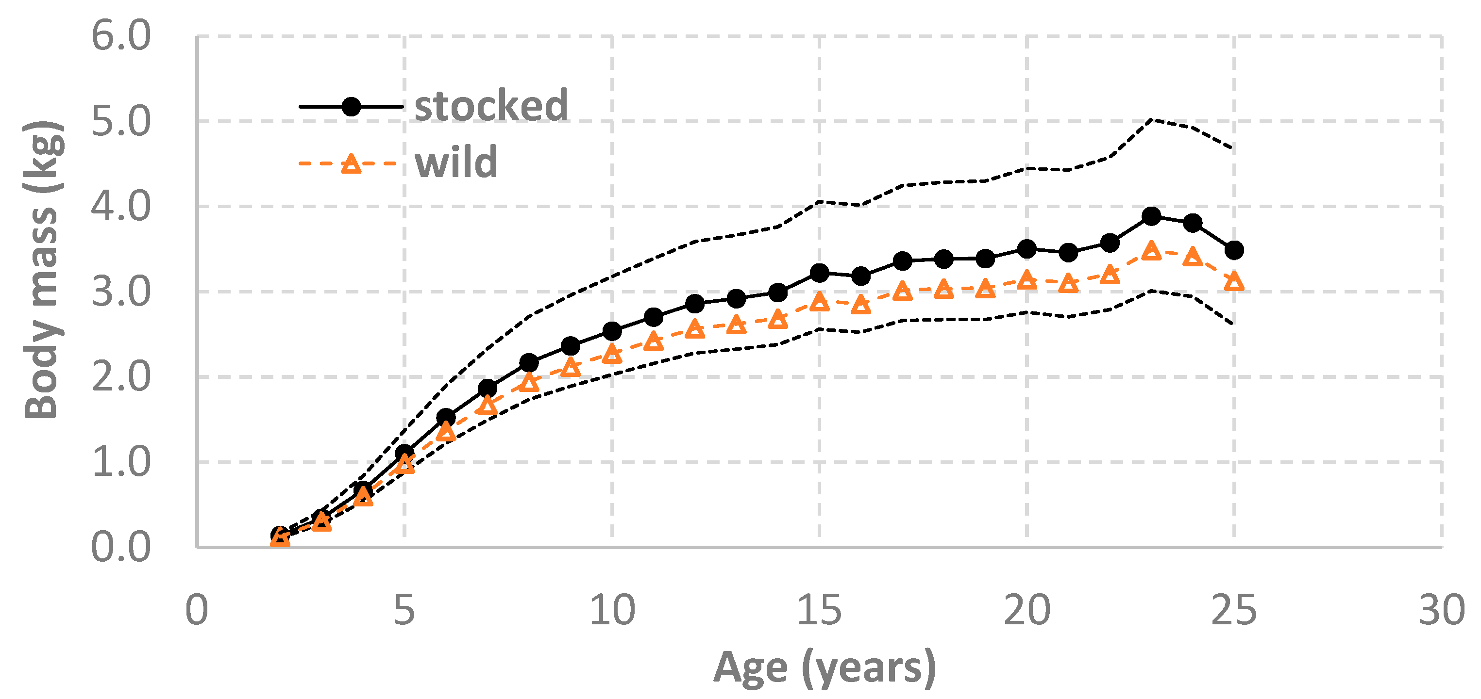 Figure 1. Comparison of lake trout (Salvelinus namaycush) body mass growth trajectory (weight-at-age) between stocked lake trout (black dot and solid line) and wild lake trout (open triangles and dashed line), based on the best linear mixed-effects model (Equation (12) and Table 2) and lake trout samples collected from the annual spring gillnetting surveys during 1975–2024 by Michigan Department of Natural Resources. Dot lines present the 95% confidence intervals for weight-at-age of stocked lake trout. Data and model estimates for age 26–32 lake trout are available (Table 1) but are not included in this figure because of small sample sizes and large confidence intervals.