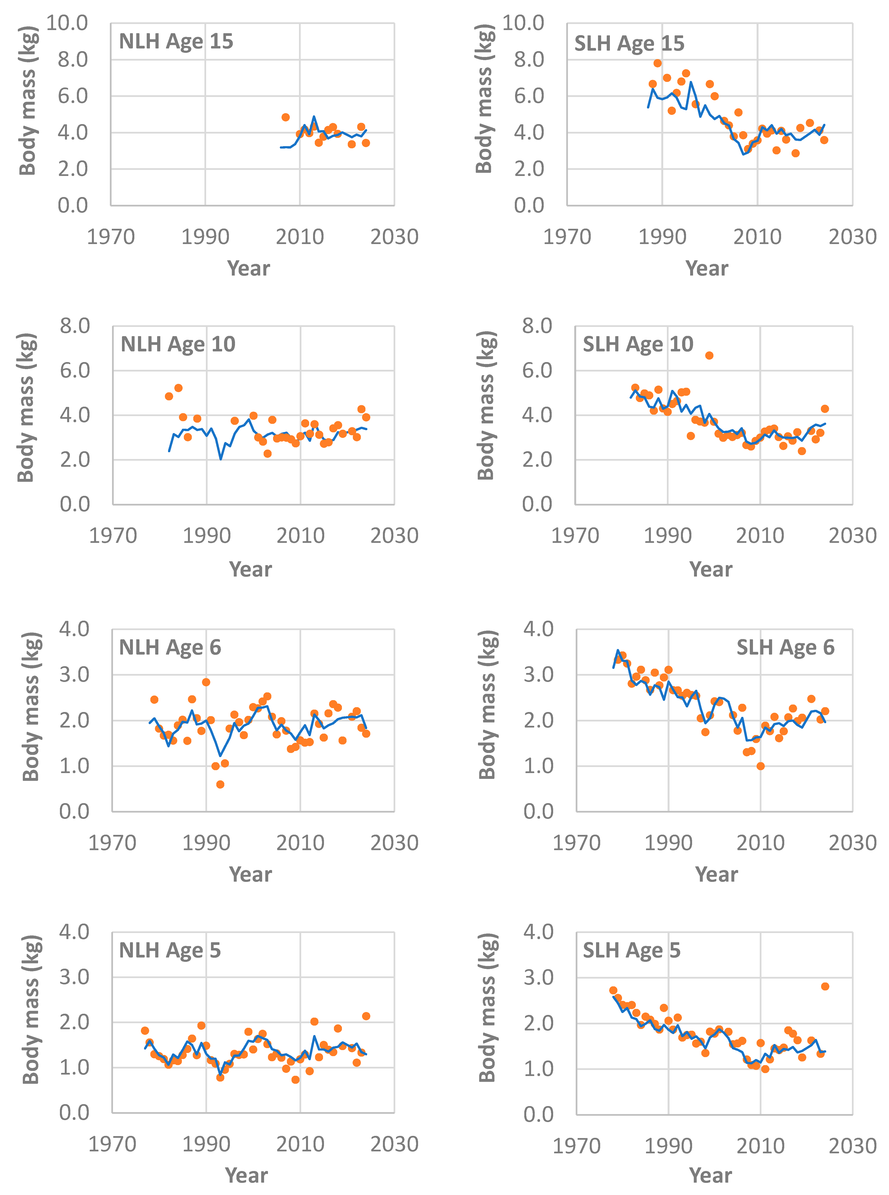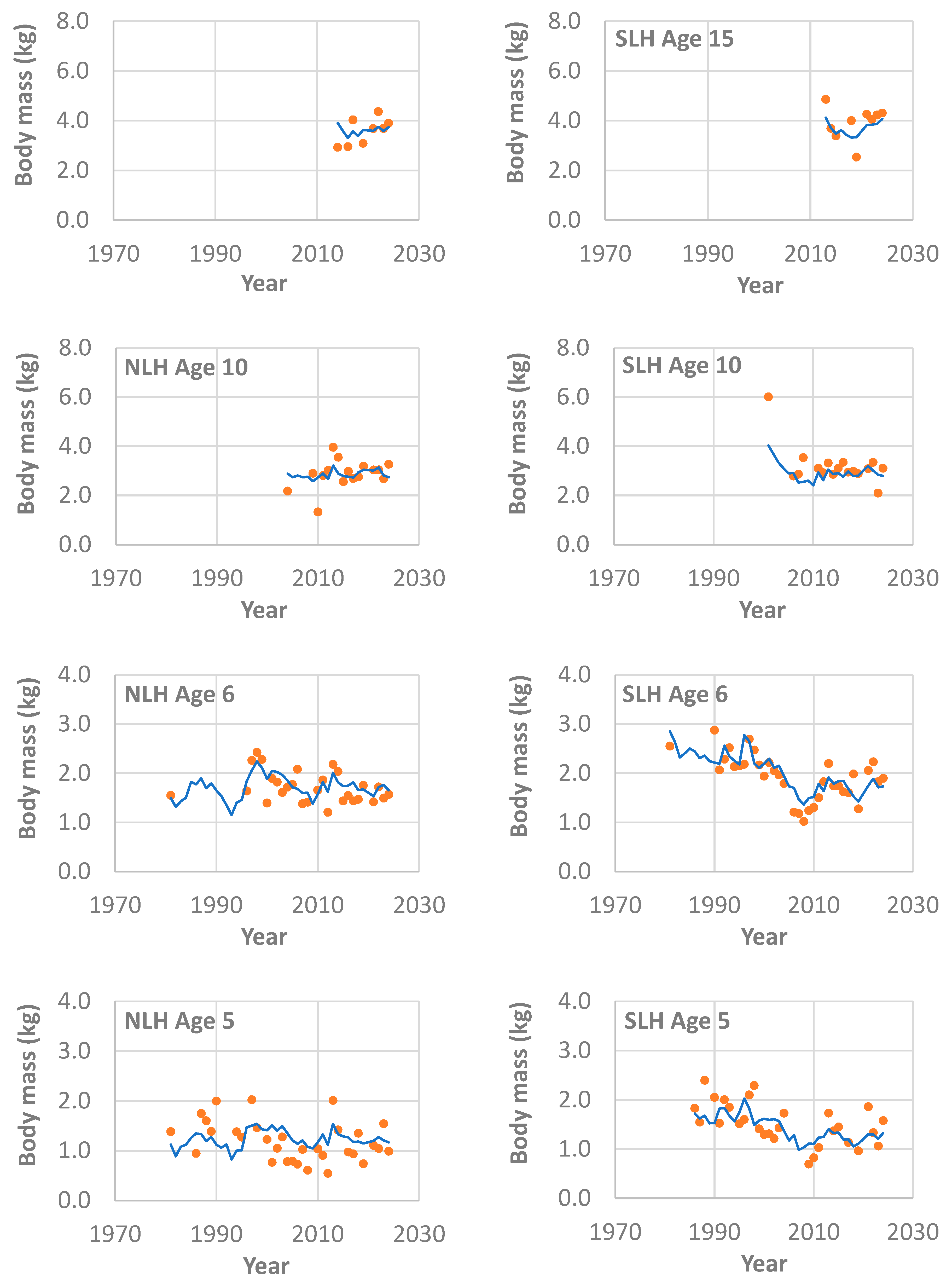 Figure 3. Comparisons between the estimated (lines) and observed (dots) body mass at ages 5, 6, 10, and 15 with variation across years for wild lake trout (Salvelinus namaycush) in northern Lake Huron (NLH) and southern Lake Huron (SLH), based on the best linear mixed-effects model (Table 2) and lake trout samples collected from the annual spring gillnetting surveys during 1975–2024 by Michigan Department of Natural Resources. Note that the Y-axis scale differs among the panels. Also note that the model estimate for the interaction between year-class and fish age was not used in the prediction of size-at-age.