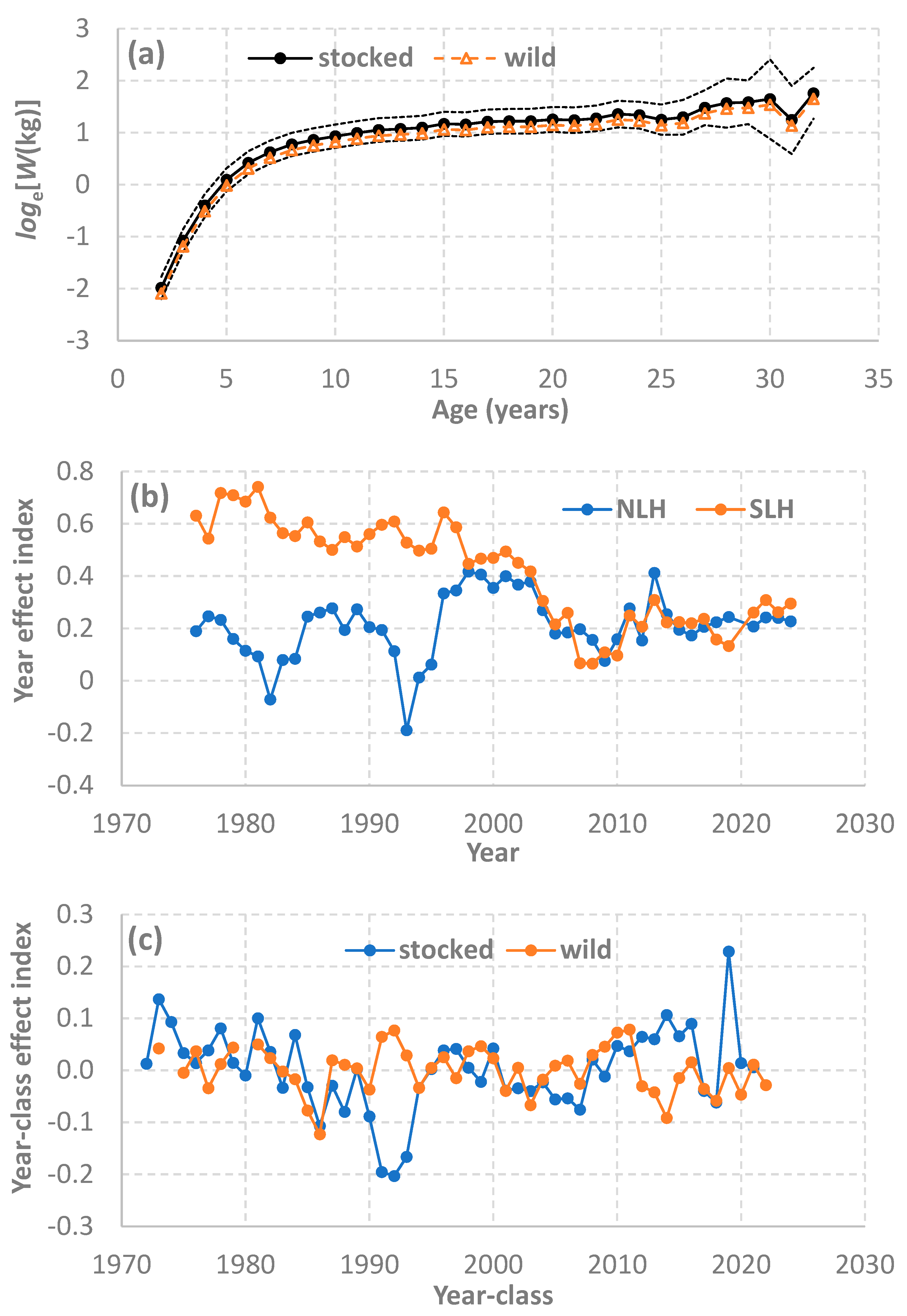 Figure 4. Lake trout (Salvelinus namaycush) body mass decomposed as the age, year, and year-class effects, based on the best linear mixed-effects model (Equation (12) and Table 2), and lake trout samples collected from the annual spring gillnetting surveys during 1975–2024 by the Michigan Department of Natural Resources. (a) The age effect represents the average trajectories of log-scale weight-at-age that are compared between stocked and wild lake trout, with 95% confidence intervals (dot lines) for stocked lake trout. (b) The year effect represents the additive year-specific growth index that differed between northern Lake Huron (NLH) and southern Lake Huron (SLH). (c) The year-class effect represents the additive cohort-specific growth index that differed between stocked and wild lake trout.