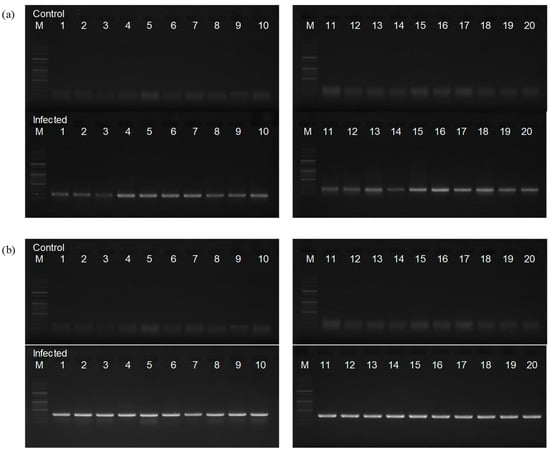 PCR-based molecular diagnosis of Enteromyxum leei infection in olive flounder (Paralichthys olivaceus). (a) PCR amplification using the primer set reported by Shin et al. [] targeting the 18S rRNA gene. (b) PCR amplification using the newly designed primer set developed in the present study. M: DNA size marker (100 bp DNA ladder, band range: 100–2000 bp, with major bands at 500, 1000, and 2000 bp); lanes 1–20: individual posterior intestine samples from the uninfected control group (top panels) and the E. leei-infected group (bottom panels).