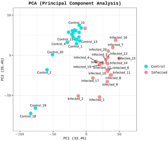 Multivariate analysis further confirmed the reliability of the dataset. PCA revealed a clear separation between the two groups, with PC1 (33.4%) and PC2 (25.4%) together explaining 58.8% of the total variance (Figure 3). Although some inter-individual variation was observed—particularly among control samples—the overall grouping pattern still reflected infection-driven transcriptomic divergence, indicating consistent biological responses among infected fish despite inherent field variability.