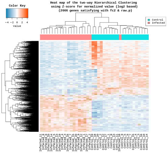 Heatmap and hierarchical clustering of DEGs. A total of 2666 DEGs (|log2FC| ≥ 2, adjusted p < 0.05) were clustered across samples. Rows represent genes, and columns represent individual samples (control and infected groups). Expression values are shown as log2 Z-scores (red = high expression, blue = low expression).