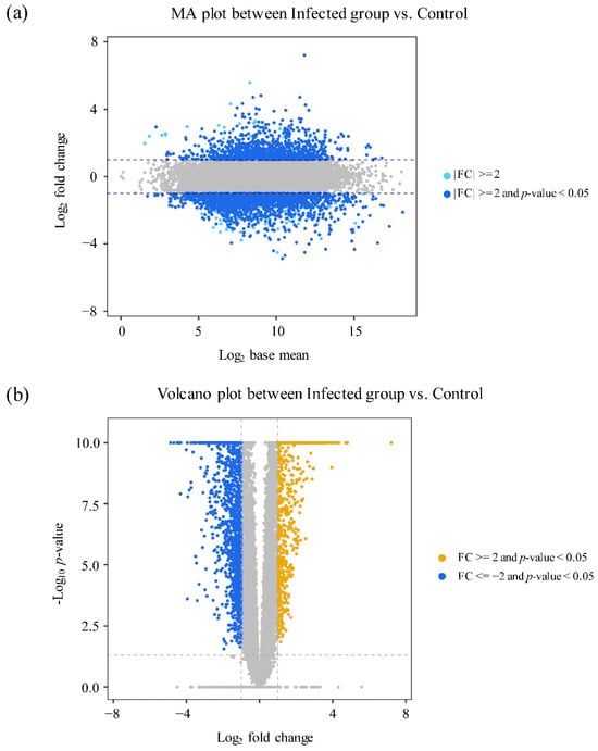 Global transcriptomic overview of DEGs. (a) MA plot displaying the relationship between mean expression and log2 fold change. Horizontal dashed lines indicate the log2 fold-change cutoffs (|log2 FC| = 1, corresponding to |FC| = 2). (b) Volcano plot illustrating upregulated DEGs (yellow), downregulated DEGs (blue), and non-significant transcripts (gray).