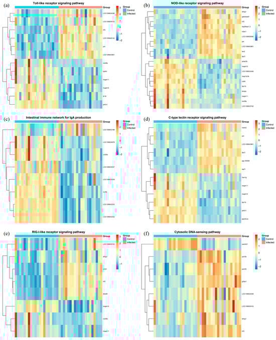 Heatmap of immune-related pathway–associated DEGs. DEGs (|log2FC| ≥ 2, adjusted p < 0.05) identified in six KEGG immune pathways were visualized after rlog transformation and row Z-score scaling. Columns represent samples (control, infected), and rows (genes) are hierarchically clustered. The pathways included: (a) Toll-like receptor signaling, (b) NOD-like receptor signaling, (c) Intestinal immune network for IgA production, (d) C-type lectin receptor signaling, (e) RIG-I-like receptor signaling, and (f) cytosolic DNA sensing.