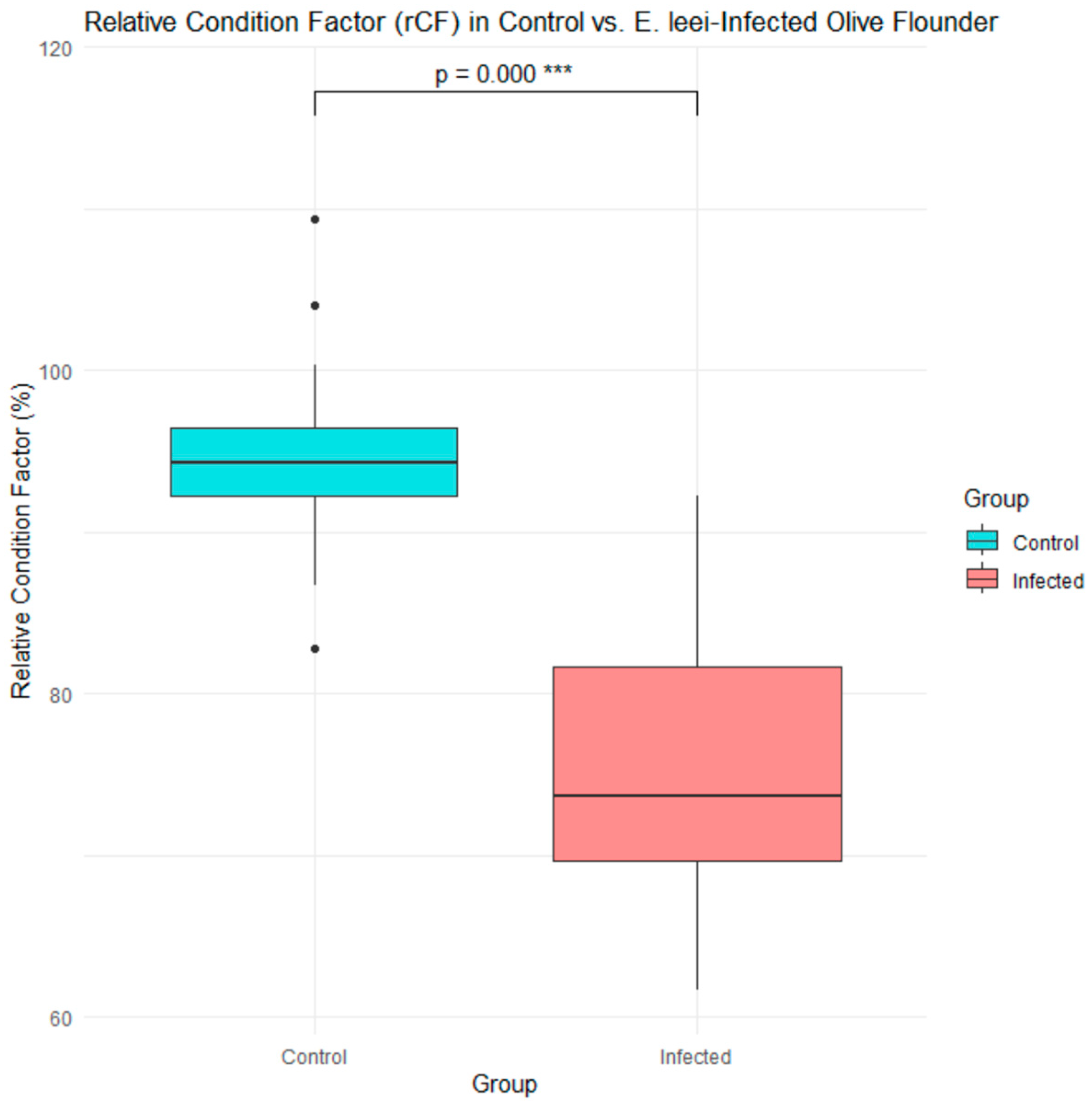 The rCF was significantly lower in the E. leei-infected group compared to that in the uninfected control group (p < 0.001). Control fish exhibited a mean rCF of 94.01% ± 4.5%, whereas the infected group showed a markedly lower mean of 73.16% ± 7.56%, consistent with the emaciation phenotype associated with chronic infection (Figure 1).