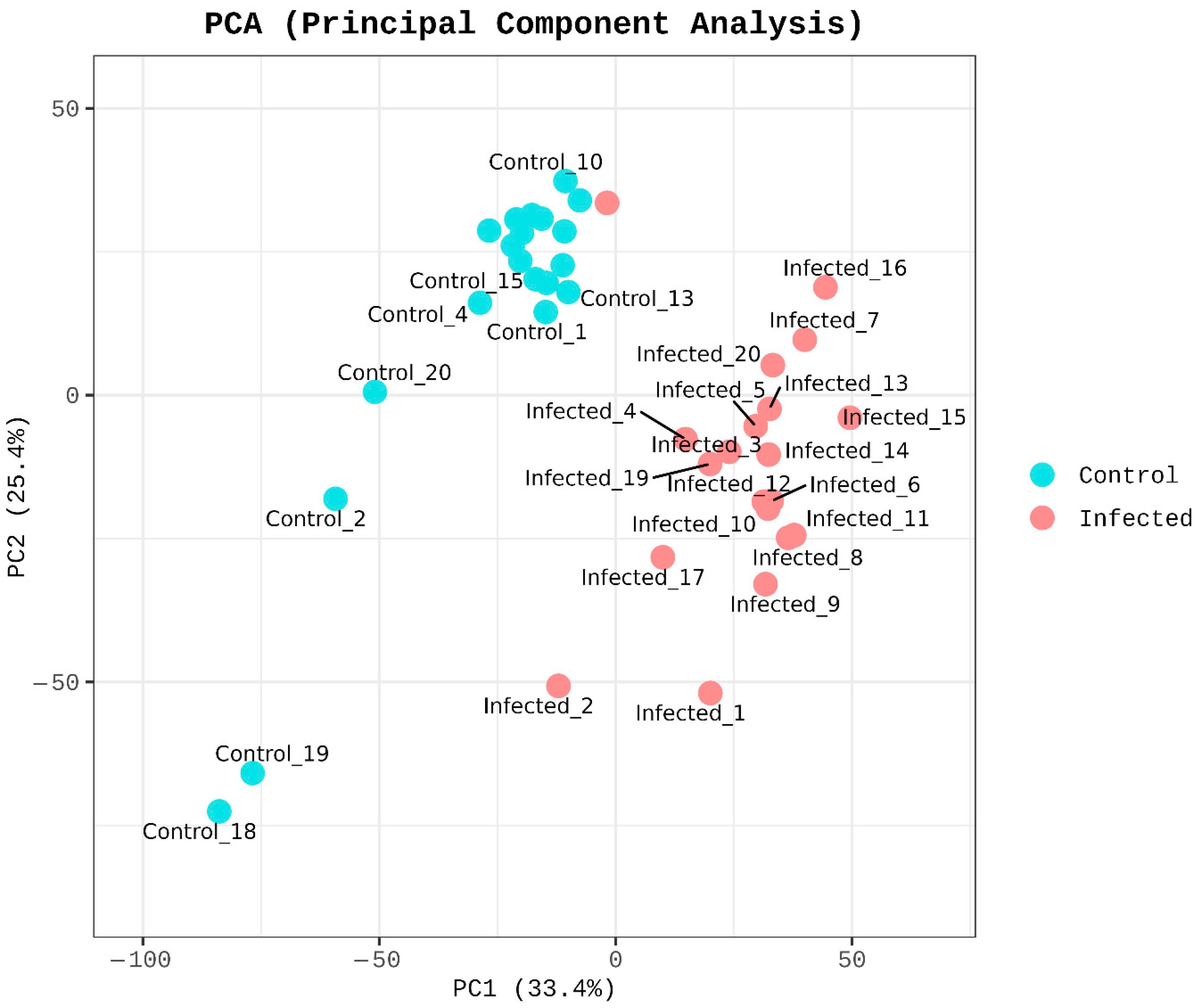 Multivariate analysis further confirmed the reliability of the dataset. PCA revealed a clear separation between the two groups, with PC1 (33.4%) and PC2 (25.4%) together explaining 58.8% of the total variance (Figure 3). Although some inter-individual variation was observed—particularly among control samples—the overall grouping pattern still reflected infection-driven transcriptomic divergence, indicating consistent biological responses among infected fish despite inherent field variability.