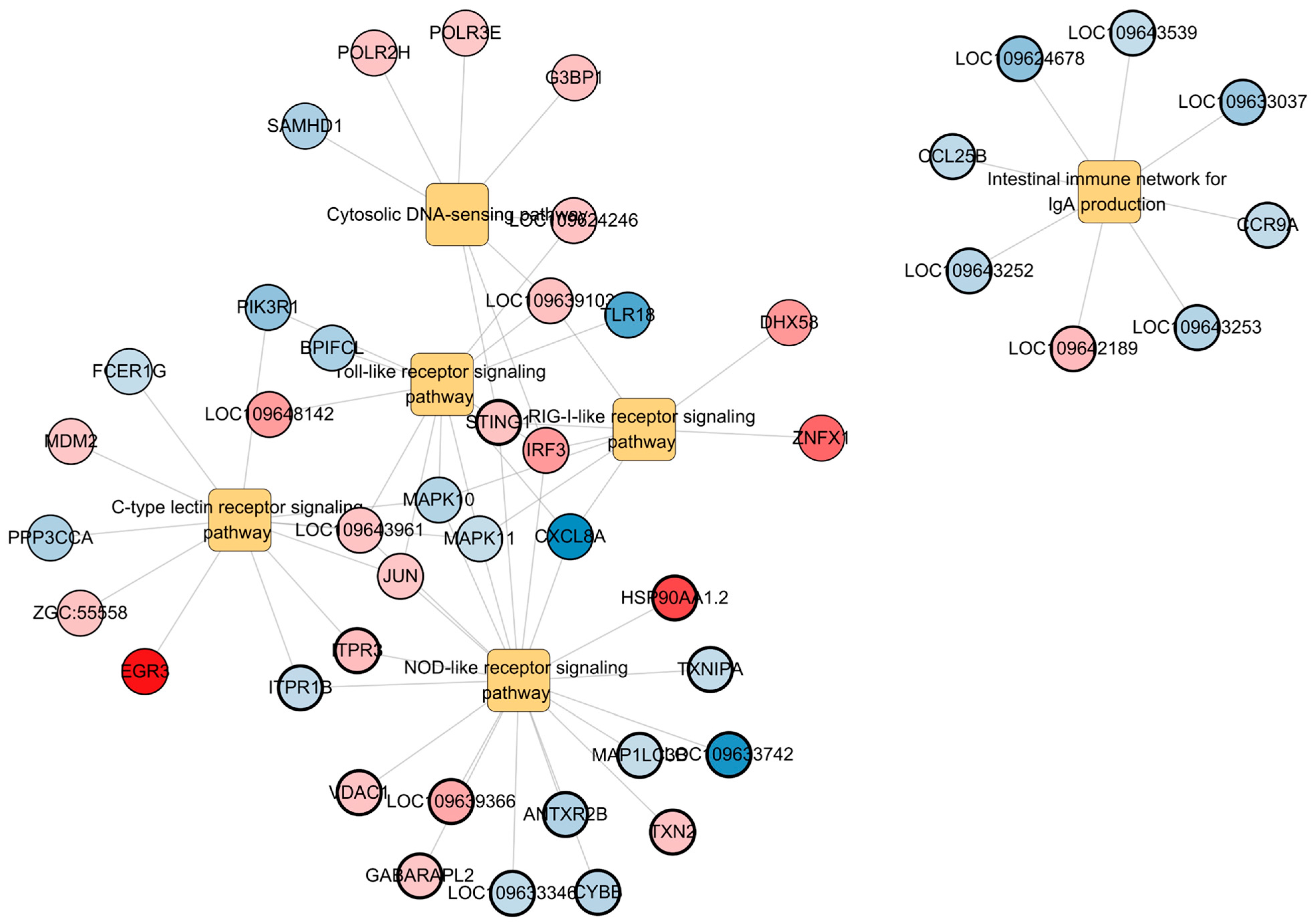 Figure 8. Gene–pathway network analysis. A Cytoscape bipartite network links immune-related KEGG pathways (rectangles) with their associated DEGs (circles). Node color represents log2 fold change (blue = downregulated, red = upregulated), and border width reflects −log10(p-value) of pathway enrichment. Shared genes (e.g., cxcl8a, pik3r1, mapk10, itpr1b, mapk11, jun, irf3, sting1, itpr3) occupy central positions, indicating crosstalk among Toll-like receptor, NOD-like receptor, C-type lectin receptor, RIG-I-like receptor, cytosolic DNA-sensing, and intestinal IgA network pathways.