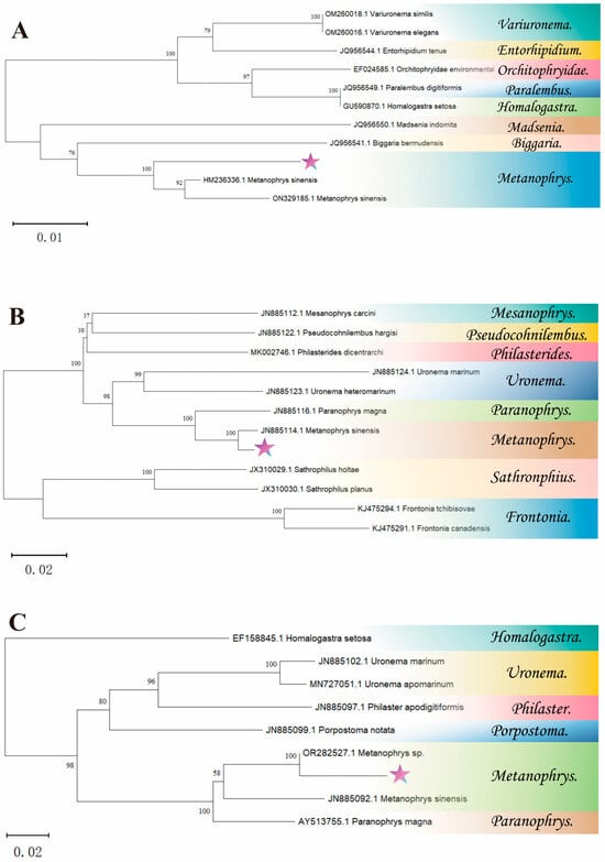 The phylogenetic tree is based on SSU rDNA, LSU rDNA and ITS1 rDNA. (A) presents the SSU rDNA phylogenetic tree, (B) illustrates the LSU rDNA phylogenetic tree, and (C) displays the ITS1 rDNA phylogenetic tree. The neighbor-joining phylogenetic trees were constructed using MEGA 11.0. The symbol star indicated the scuticociliatid ciliate.