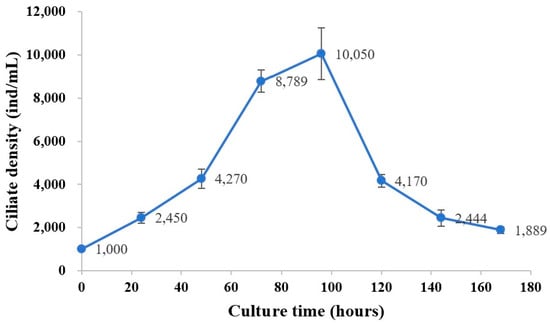 Ciliates were cultured in a 19 mL medium at 25 ± 1 °C and exhibited a growth phase on day 3, reaching a maximum on day 4. Then, the number of ciliates began to decrease and returned to the initial level on day 8. The average natural growth rate was 0.577 from day 1 to 4 (Figure 4).