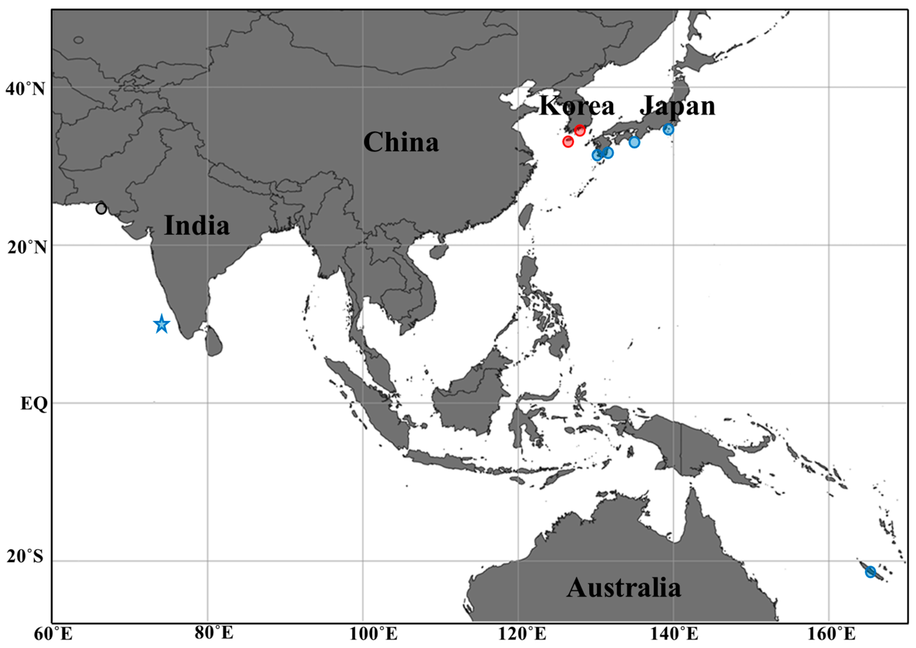 Figure 1. Sampling areas and distribution records of Sphyraena arabiansis. The blue star, blue circle, black circle, and red circle indicate the sampling areas of Abdussamad et al. [8], Morishita et al. [10], Manzoor et al. [9], and the present study, respectively.