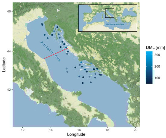 Map of Loligo vulgaris sampling stations within MEDITS surveys in June 2019, 2020, and 2021 in the Eastern Adriatic Sea (DML—dorsal mantle length). The red line represents the Ancona–Zadar line dividing the North and Central Adriatic sub-basins. The maps were produced using the ggmap package v4.0.0 [21] for R and tiles by © Stadia Maps (https://stadiamaps.com/), © Stamen Design (https://stamen.com/), © OpenMapTiles (https://openmaptiles.org/), and © OpenStreetMap (https://www.openstreetmap.org/#map=5/39.723/19.314 (accessed on 28 January 2025)) contributors. This figure is not covered by the CC BY license and is subject to copyright.