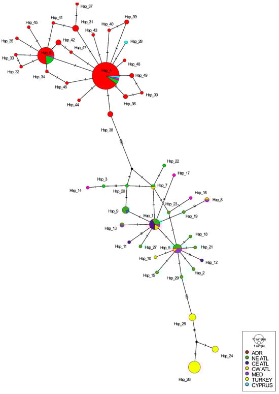 The median-joining haplotype network revealed three well-defined haplotype clusters across the seven geographical groups (Figure 2). The first cluster contained all major Adriatic haplotypes along with the few shared sequences from Cyprus, the Mediterranean, and the NE Atlantic, forming a cohesive Adriatic-centered group. Within this cluster, Adriatic individuals (n = 91) predominantly belonged to two high-frequency haplotypes (Hap 4 and Hap 6), which were also shared with a small number of Mediterranean samples (n = 3), two individuals from Cyprus, and ten individuals from the NE Atlantic. A second, clearly separated cluster comprised haplotypes shared among the Mediterranean, NE Atlantic, CE Atlantic, and CW Atlantic groups, but it notably excluded sequences from the Adriatic, Cyprus, and Turkey. These two main clusters were divided by five mutational steps, indicating a marked genetic discontinuity between Adriatic-associated haplotypes and the broader Mediterranean–Atlantic assemblage. The Turkish haplotypes formed a third distinct cluster branching from the Mediterranean–Atlantic group.