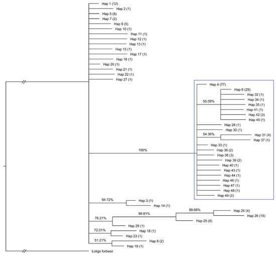 A phylogenetic tree of all haplotypes was reconstructed in Geneious Prime v2023.4 software using the Bayesian inference method, with the HKY+F+I evolutionary model. The best-fit evolutionary model was selected based on the Bayesian information criterion (BIC) calculated using the IQ-TREE web server with auto model selection [34,35,36,37]. Loligo forbesii (OK135754) was selected as the outgroup sibling species. The phylogenetic tree was visualized and processed graphically using FigTree v1.4.4 (http://tree.bio.ed.ac.uk/software/figtree (accessed on 10 February 2025); Edinburgh, UK).