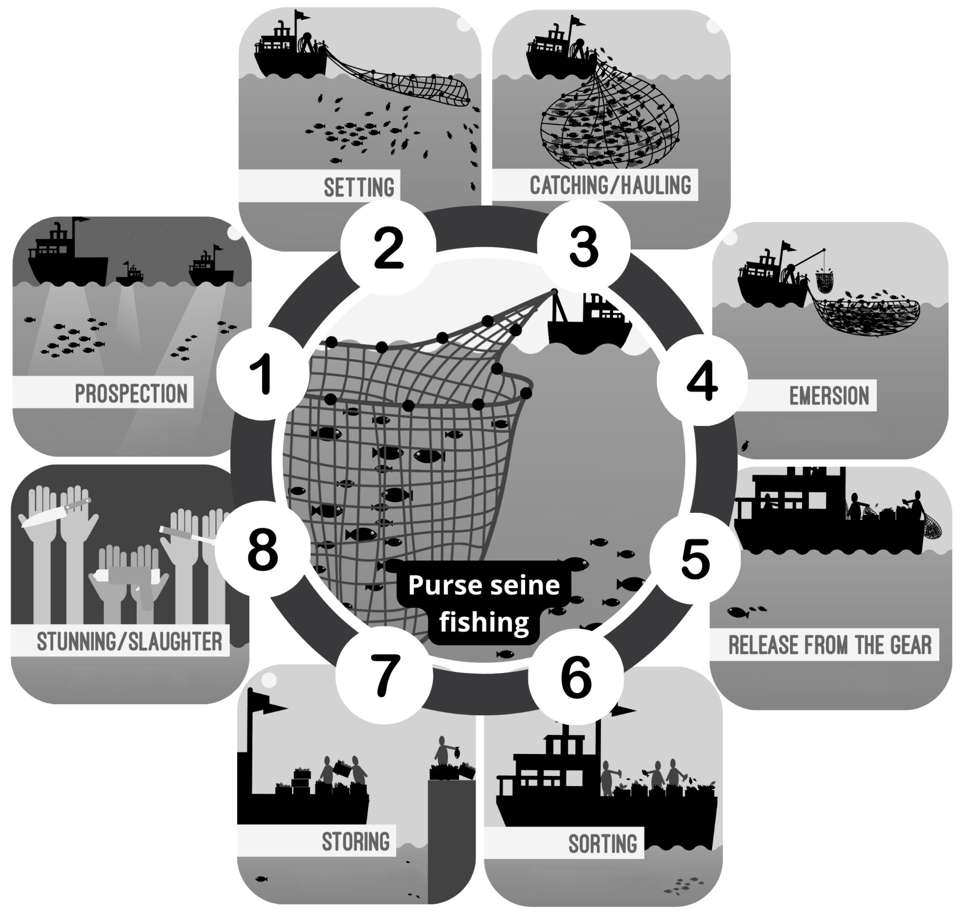 - Describes the operational phases of the purse seine fishing method and identifies welfare hazards at each stage for these small pelagic species;