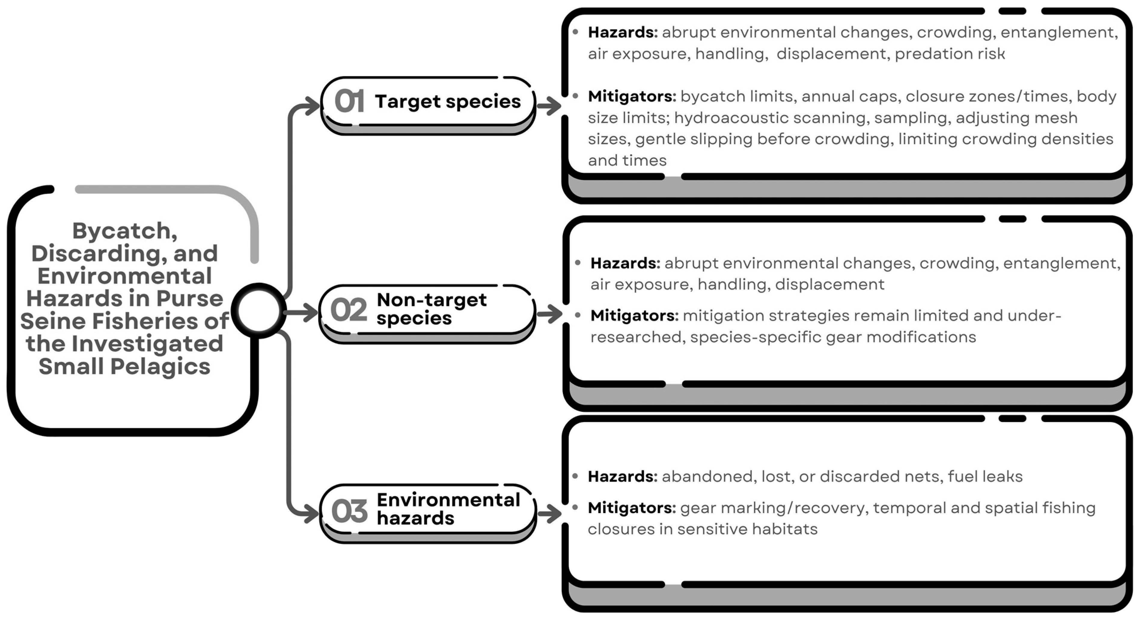 - Discusses bycatch and discarding issues in addition to environmental impacts, such as ghost fishing, which are related to purse seine fishing of these small pelagic species;