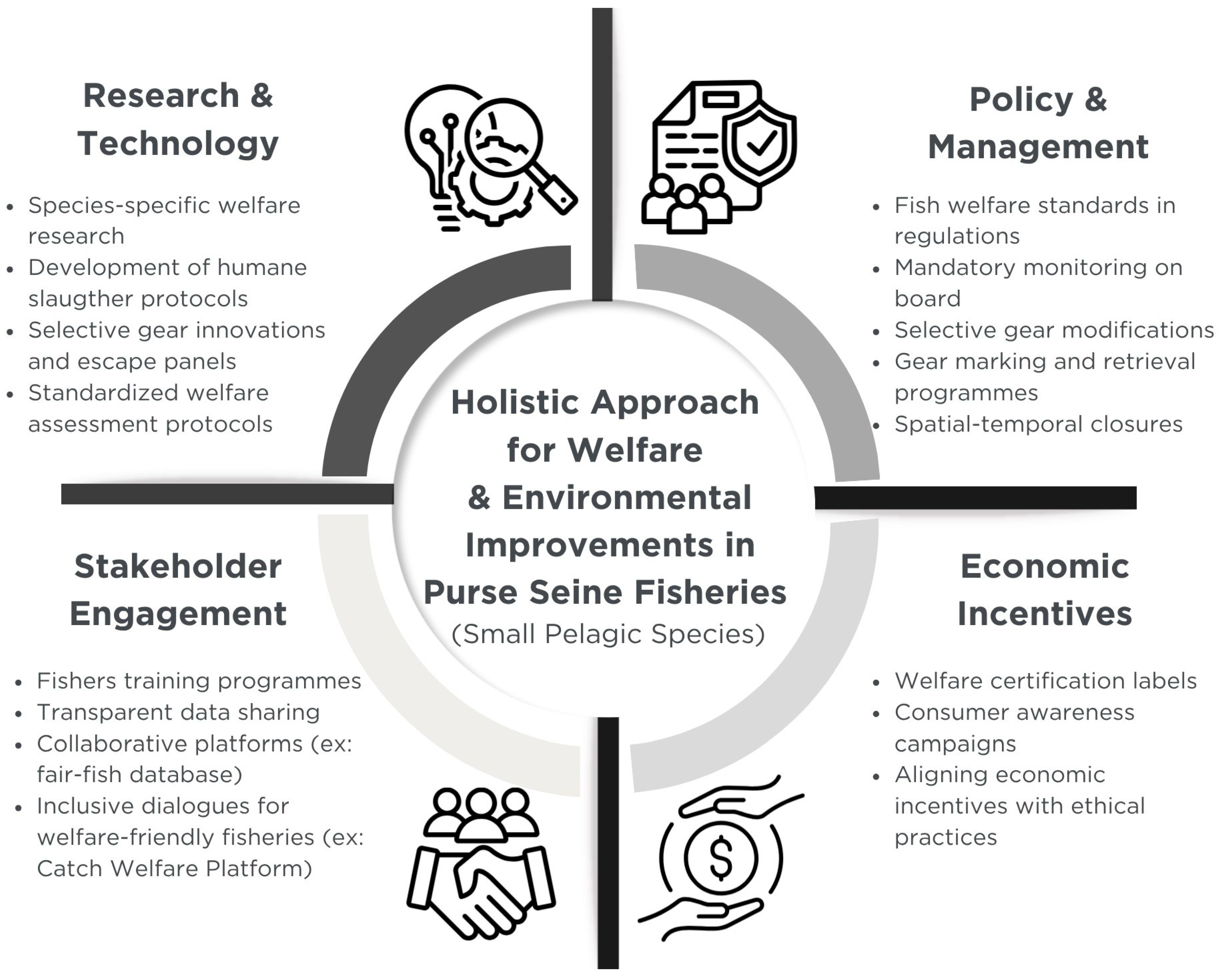 - Proposes research priorities, integrative approaches, policy and management frameworks, and compliance mechanisms to address the welfare of these small pelagic species during purse seining.