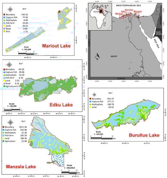 Further east lies Lake Burullus, the second largest of the Nile Delta Lakes, centrally located between the Rosetta and Damietta Nile branches. This lake connects directly to the Mediterranean Sea through the El-Boughaz inlet. Lake Burullus is currently recognized as the most productive Egyptian lake, yielding around 104.5 thousand tons in 2022 [12]. Its fisheries are characterized by high species diversity, including salt, brackish, and freshwater species, with the family Cichlidae being the most abundant, closely followed by Mugilidae. The lake’s hydrology is complex, receiving a mix of polluted drainage water from eight drains and supplemental fresh Nile water via the Brenbal Canal. Finally, Lake Manzala is the largest of Egypt’s Nile Delta lakes and one of the most important aquatic ecosystems in the Mediterranean basin. Situated along the northeastern coast, the lake currently spans approximately 572 km2. Despite facing severe degradation challenges [15,16], it remains a critical asset, contributing nearly 14% of Egypt’s total annual fish production [12,15].