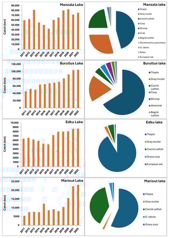 Annual total fish catch fluctuation (tons) in the four Nile Delta lakes (Manzala, Burullus, Edku, and Mariout) during the period from 2011 to 2022 (Bar Charts), and the average contribution of different fish groups and species to the total catch for each lake over the same period (Pie Charts). Data for each lake were sourced from GAFRD annual statistical books [12].