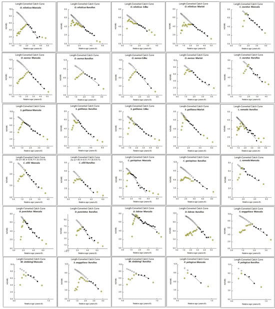 The growth parameters estimated via the VBGF varied among species and lakes, reflecting differences in life history strategies and environmental pressures. The estimated age, growth parameters (L∞, K, t0), and mortality rates (F, M, Z) derived from the analysis are summarized in Table 3. The asymptotic length (L∞), representing the theoretical maximum size, was highest for the commercially important Clarias gariepinus in both Manzala (86.78 cm) and Burullus (76.91 cm). Conversely, the growth coefficient (K), which indicates how quickly a species reaches its asymptotic length, was notably high for the crustaceans, Metapenaeus stebbingi and Portunus pelagicus, indicating rapid growth and short lifespans typical of invertebrate stocks. The total mortality rate (Z) for each species was presented by applying the Length-Converted Catch Curve (LCCC) method to the length frequency data, with the resulting linearized plots shown in Figure 3.