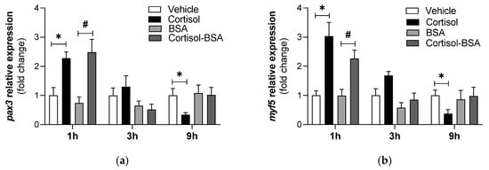 Expression of pax3 (a) and myf5 (b) in myotubes stimulated with cortisol or cortisol-BSA. pax3 and myf5 expression values were normalized against the expression of fau as reference gene. The results are expressed as a means ± SEM of three biological replicates (n = 3) in three independent experiments. * Indicates significant differences (p-value < 0.05) between vehicle and cortisol group. # Indicates significant differences (p-value < 0.05) between BSA and Cortisol-BSA group. Differences among groups were analyzed by one-way ANOVA followed by Tukey’s post hoc test for multiple comparisons.