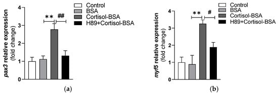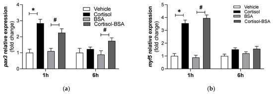 To further assess cortisol-mediated regulation of pax3 and myf5, in vitro rainbow trout myotubes were stimulated with cortisol or cortisol-BSA for 1 and 6 h. Consistent with the in vivo results, pax3 mRNA levels were elevated after 1 h of treatment with either cortisol (2.84 ± 0.25-fold change) or cortisol-BSA (2.25 ± 0.24-fold change) (Figure 2a). A similar trend was observed for myf5 expression, with both cortisol and cortisol-BSA treatments inducing an increase at 1 h (3.55 ± 0.25-fold change; 3.95 ± 0.26-fold change, respectively). Notably, a significant increase in pax3 expression was also observed at 6 h in myotubes treated with cortisol-BSA (1.74 ± 0.19-fold change) (Figure 2a).