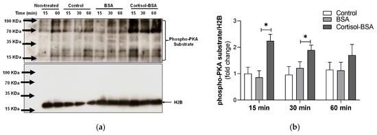 PKA activation in rainbow trout myotubes induced by cortisol-BSA at 15, 30, or 60 min after treatment. (a) Western blot of phospho-PKA substrate and H2B. (b) Densitometric analysis of the Western blot showing a phospho-PKA substrate/H2B ratio. The results are expressed as a means ± SEM of three biological replicates (n = 3) in three independent experiments. Non-treated group is internal control and is not considered in densitometric analysis. * Indicates significant differences (p-value < 0.05) compared with the BSA group. Differences among groups were analyzed by one-way ANOVA followed by Tukey’s post hoc test for multiple comparisons.