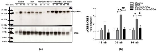 Moreover, CREB phosphorylation increased at 30 and 60 min following cortisol-BSA stimulation (3.2 ± 0.21-fold change; 2.67 ± 0.25-fold change, respectively), and this effect was reduced in the presence of H89 (1.34 ± 0.22-fold change; 1.51 ± 0.32-fold change, respectively) (Figure 4a,b).