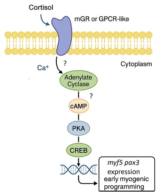 Taken together, our findings support a model in which cortisol binds to a membrane-associated receptor, potentially a membrane glucocorticoid receptor (mGR) or a GPCR-like protein, promoting a putative Ca2+ influx and the adenylate cyclase activation. These events elevate intracellular cAMP levels, activating PKA and leading to CREB phosphorylation, which in turn induces the early transcription of pax3 and myf5 (Figure 6).