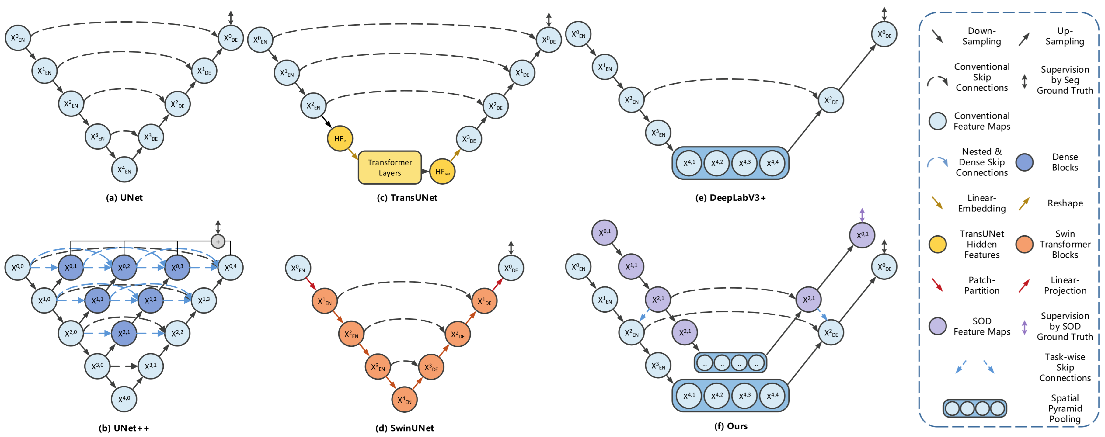 | Model | Backbone | SOD-Branch | Multi-Task | Acc (%) ↑ | Dice (%) ↑ | ASD (Pixel) ↓ | HD95 (Pixel) ↓ | Flops (G) | Params (M) |