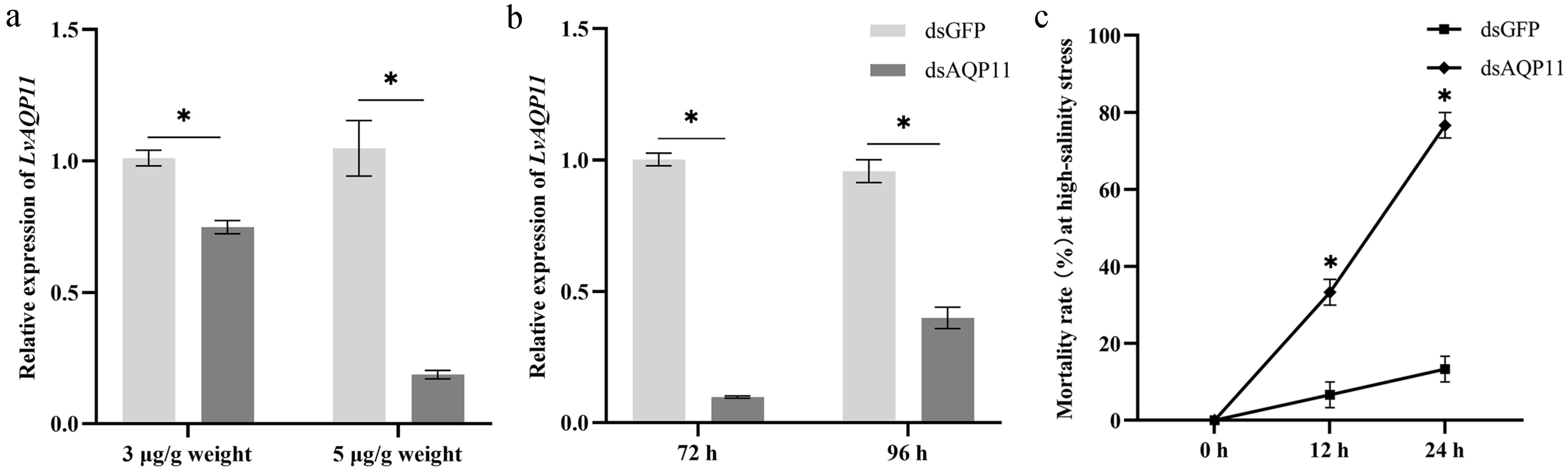 2.3. Impact of LvAQP11 Knockdown on Salinity Adaptation