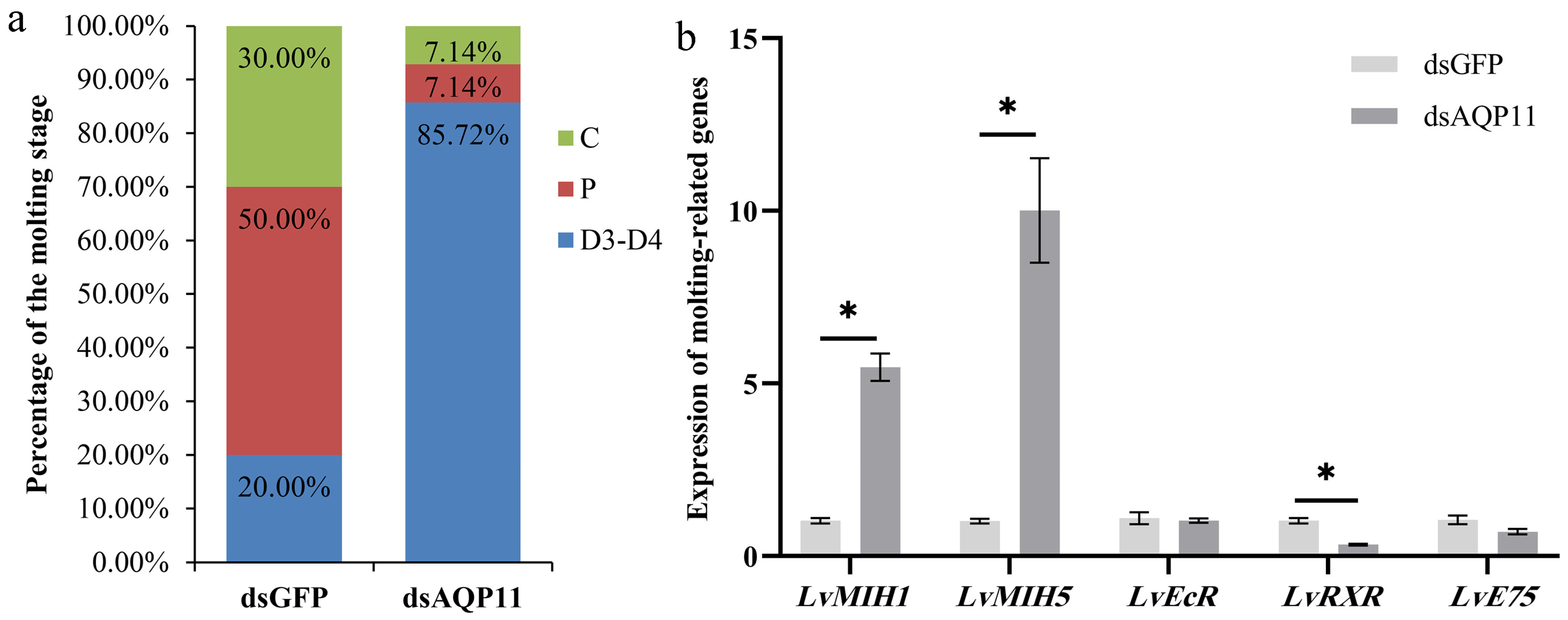 3.5. Effect of LvAQP11 Knockdown on Molting Cycle