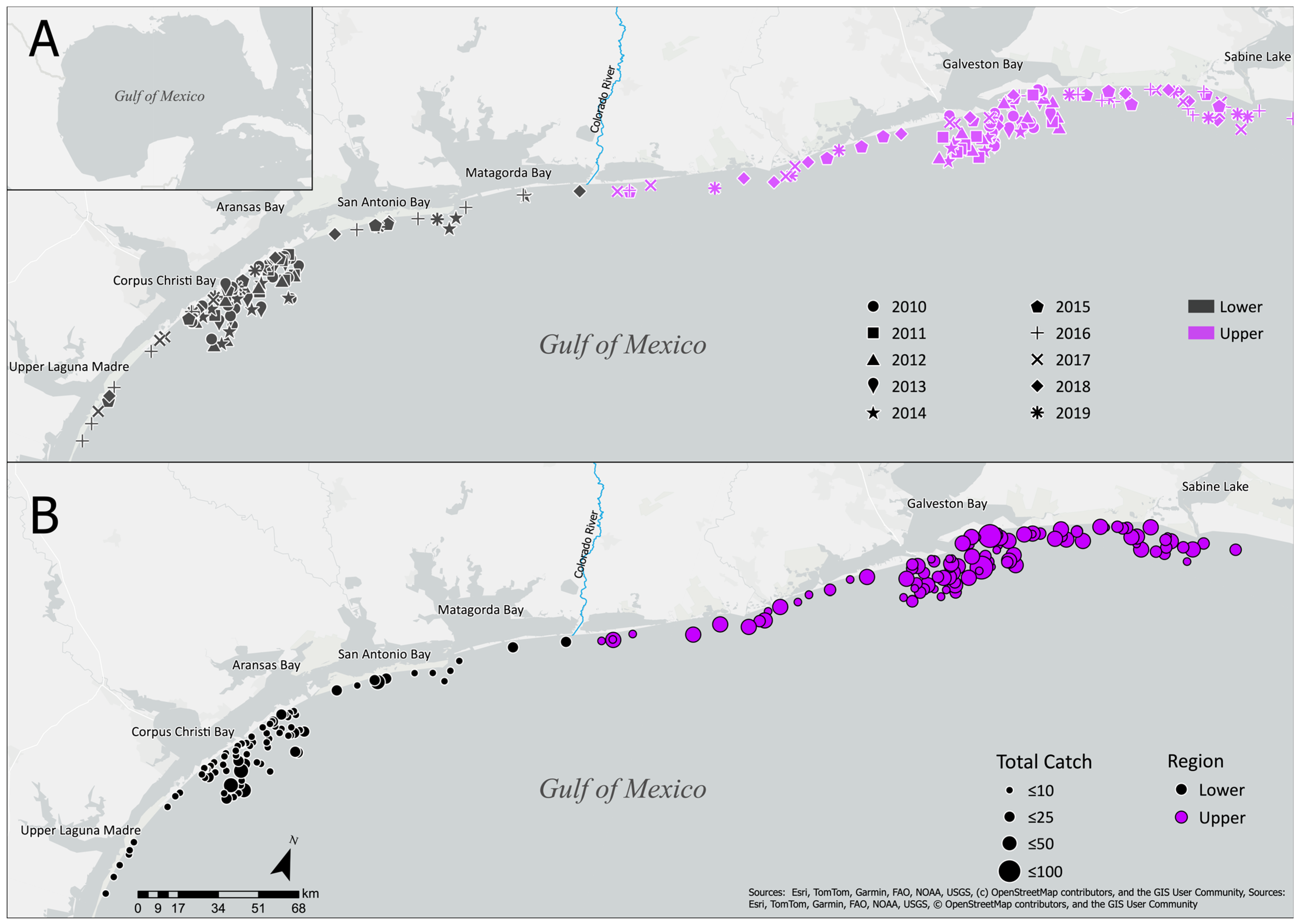 - TinHan, T.C.; Wells, R.J.D. Spatial and Ontogenetic Patterns in the Trophic Ecology of Juvenile Bull Sharks (Carcharhinus leucas) From the Northwest Gulf of Mexico. Front. Mar. Sci. 2021, 8, 664316. [Google Scholar] [CrossRef]