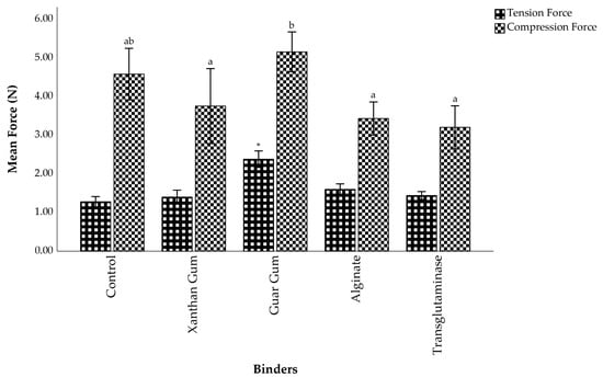 Comparison of pellet texture (tension and compression force) in diets formulated with different binders. An asterisk (*) indicates a significant difference in tension force between binders (p < 0.05), while different superscript letters (a,b) denote significant differences in compression force among binders.