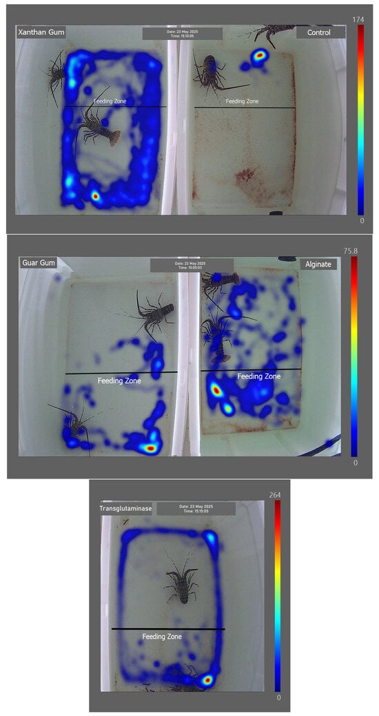 Lobsters fed with the control diet remained in the feeding zone throughout the observation period (Figure 3), exhibiting minimal movement (Figure S1). In contrast, individuals receiving the xanthan gum treatment were detected outside the feeding zone for extended periods. Lobsters fed diets containing guar gum, alginate, and transglutaminase spent a greater proportion of time within the feeding zone. However, they were also frequently detected outside the feeding zone, exhibiting high mobility.