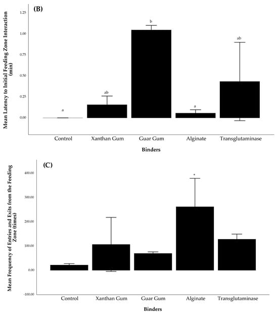 Quantitative analysis of feeding behaviour of P. ornatus (A). Cumulative duration in the feeding zone (B). Latency to initial feeding zone interaction (C). Frequency of entries and exits from the feeding zone. Different superscript letters (a,b) in (A,B) indicate significant differences among binders for cumulative feeding zone duration and latency to initial interaction, respectively (p < 0.05). An asterisk (*) in (C) indicates a significant difference in the frequency of feeding zone entries and exits (p < 0.05).