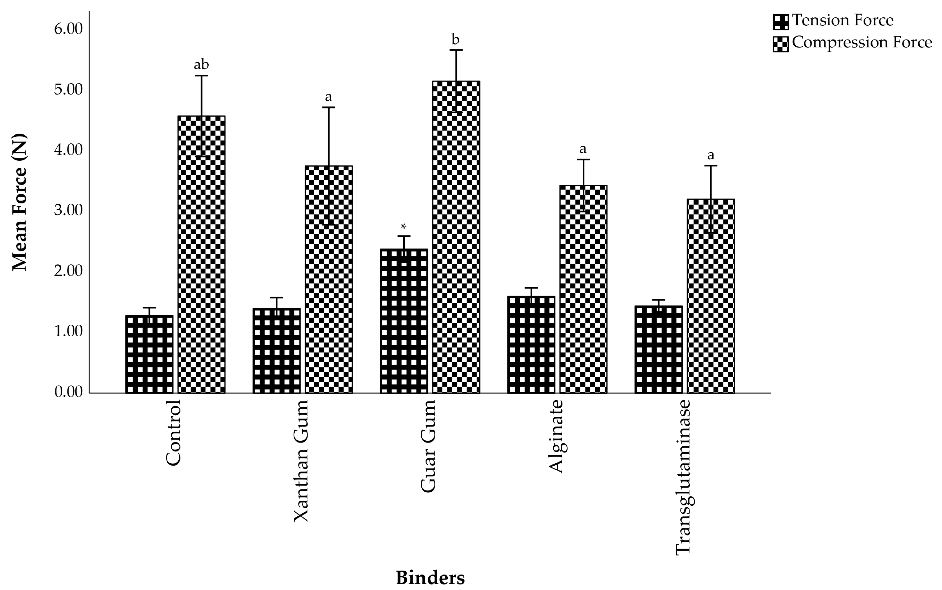 | Transglutaminase | 0.89 ± 0.03 | 26.37 ± 1.00 | 0.18 ± 0.07 | 0.51 ± 0.07 | 0.69 ± 0.04 |
