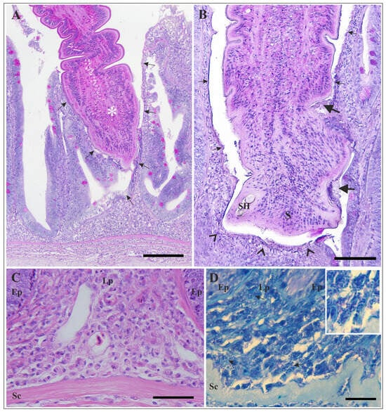 Histological sections of the intestine of Esox lucius infected with Triaenophorus nodulosus. (A) High magnification of the attachment site shown in Figure 2. Necrosis and complete loss of the mucosal epithelium adjacent to the embedded part of the strobila (asterisk) are visible (arrows). PAS staining. (B) Section of the intestinal wall at the site of attachment, showing loss of the mucosal epithelium (arrows) and shallow ulceration (arrowheads). Remnants of the damaged mucosal surface are attached to the microtriches of the cestode (thick arrows). PAS staining. (C) High magnification of the intestinal wall beneath the site of attachment. Note the abundant presence of mast cells in the lamina propria and superficial submucosa. H&E staining. (D) Numerous mast cells undergoing intense degranulation are visible beneath the site of attachment (arrows). Inset: High magnification of several mast cells. Note the free granules adjacent to the mast cells. TB staining. Scale bars: (A) = 200 µm; (B) = 100 µm; (C) = 50 µm; (D) = 20 µm. Abbreviations: S—scolex; SH—scolex hook; Ep—epithelium; Lp—lamina propria; Sc—stratum compactum.