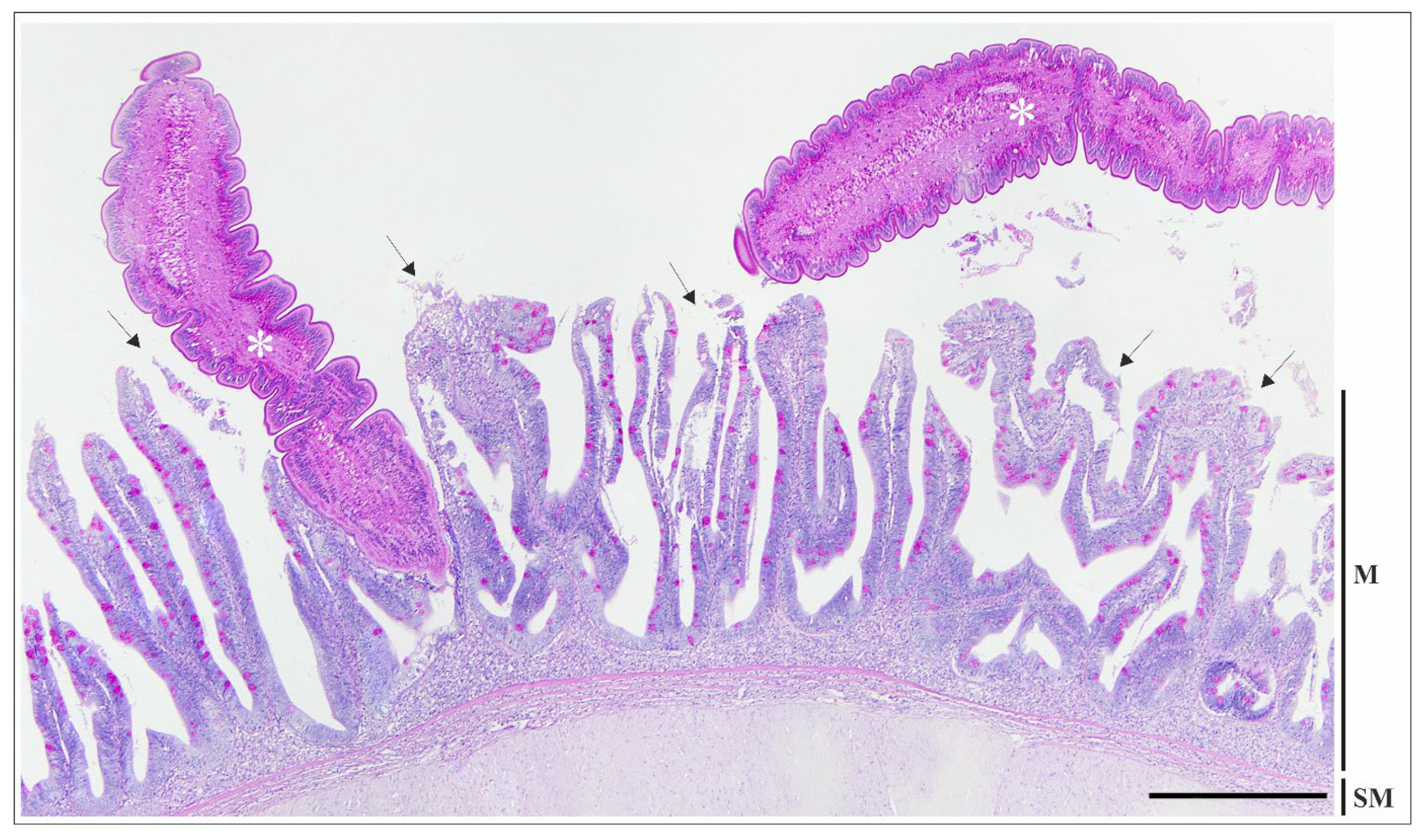 - Lumsden, J.S. Gastrointestinal Tract, Swimbladder, Pancreas and Peritoneum. In Systemic Pathology of Fish: A Text and Atlas of Normal Tissues in Teleosts and Their Responses in Disease, 2nd ed.; Ferguson, H.W., Ed.; Scotian Press: London, UK, 2006; pp. 168–199. [Google Scholar]