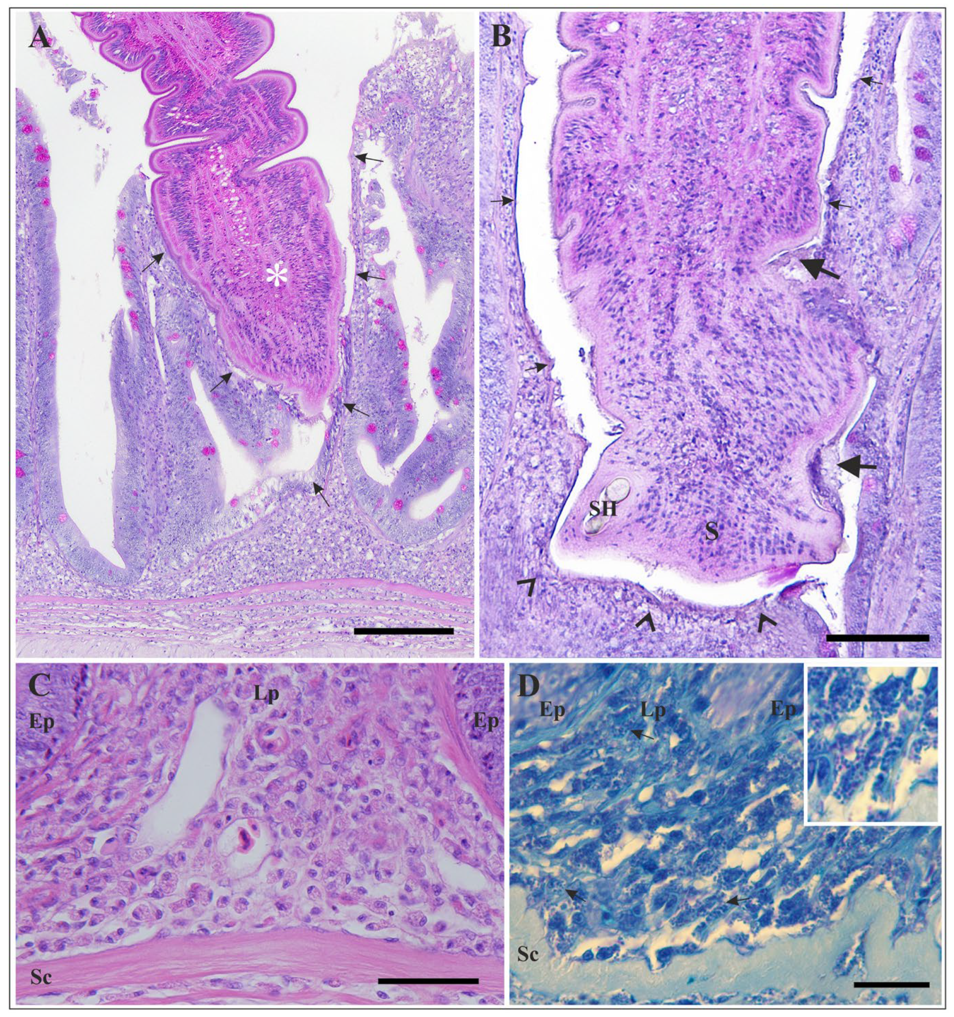 - Sayyaf Dezfuli, B.; Franchella, E.; Bernacchia, G.; De Bastiani, M.; Lorenzoni, F.; Carosi, A.; Lorenzoni, M.; Bosi, G. Infection of endemic chub Squalius tenellus with the intestinal tapeworm Caryophyllaeus brachycollis (Cestoda): Histopathology and ultrastructural survey. Parasitology 2024, 151, 157–167. [Google Scholar] [CrossRef]